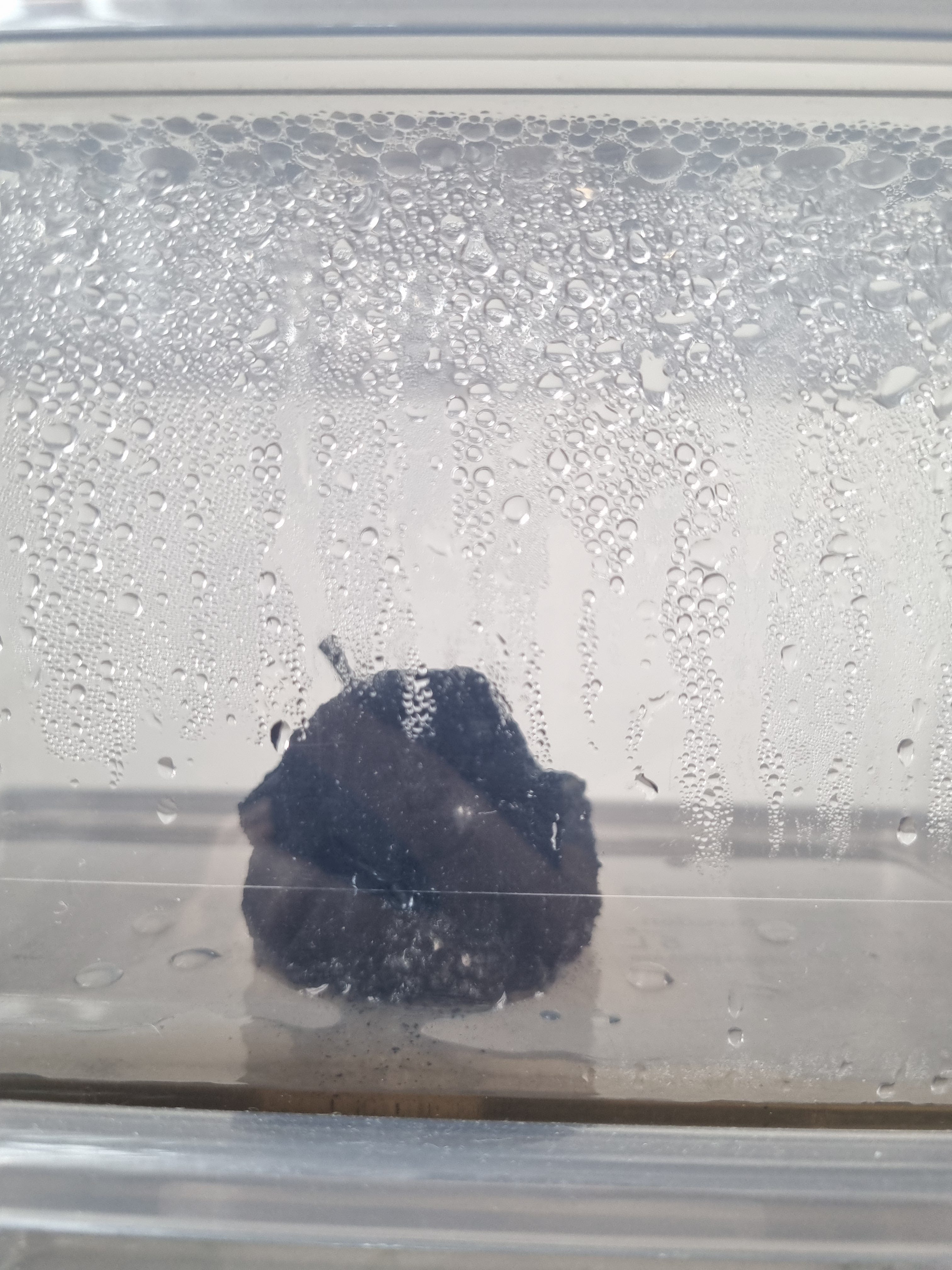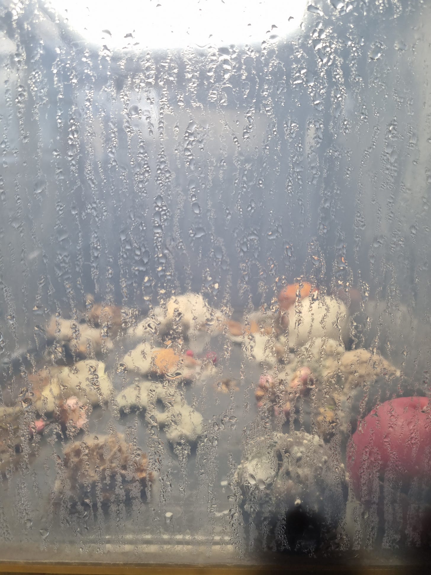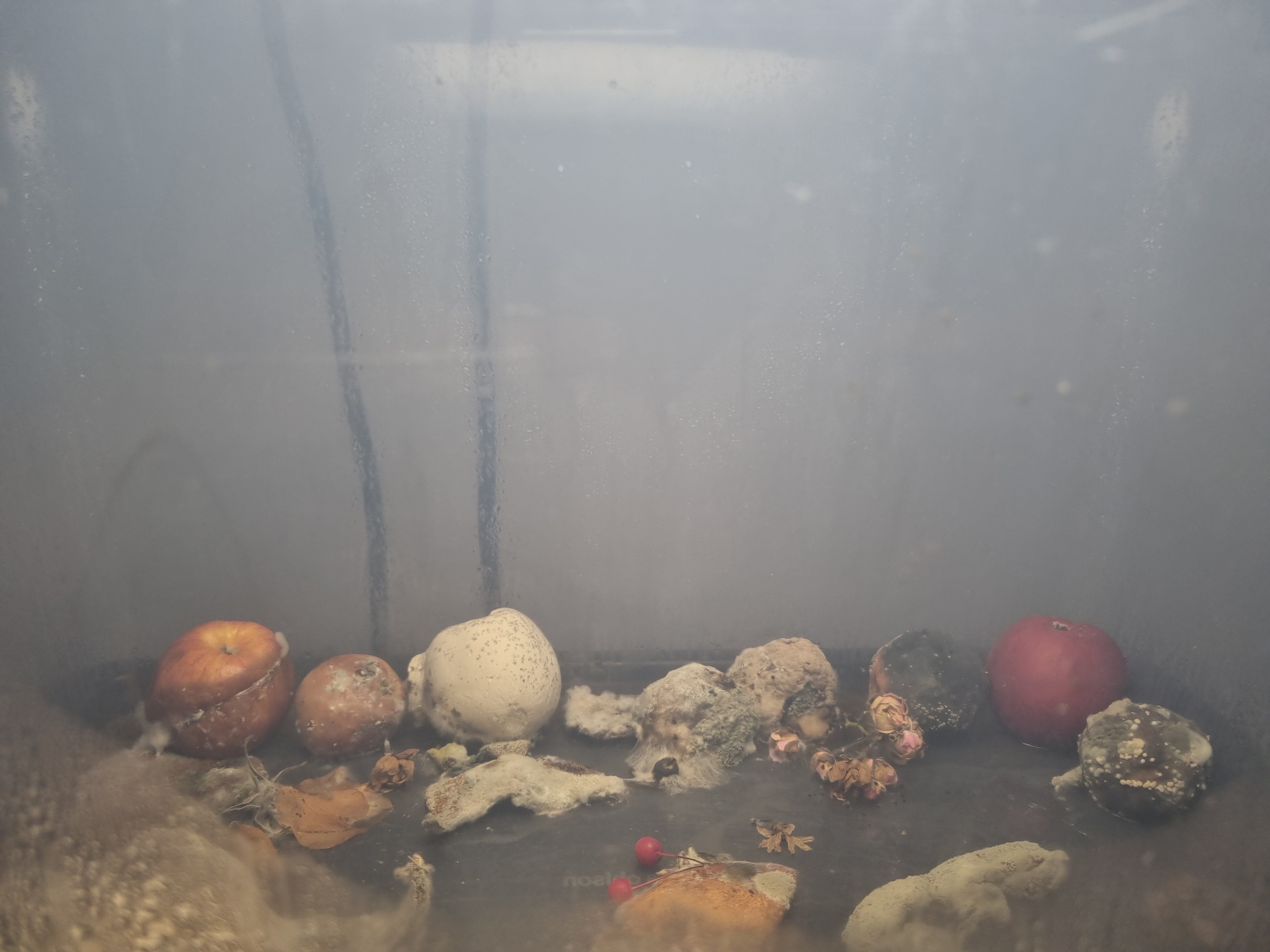 Men hela tiden hindras jag som betraktare från att helt ta del av processen, formerna och färgerna: i de flesta lådor bildas kondens som helt eller delvis skymmer sikten. Undantag är lådor som främst innehåller torra eller inorganiska material som torkade blommor, stenar eller 3d-printade plastäpplen. Men det är inte främst de som lockar mig. Man får helt enkelt böja sig ned, sätta sig på huk, komma riktigt nära och kika in mellan vattendropparna.