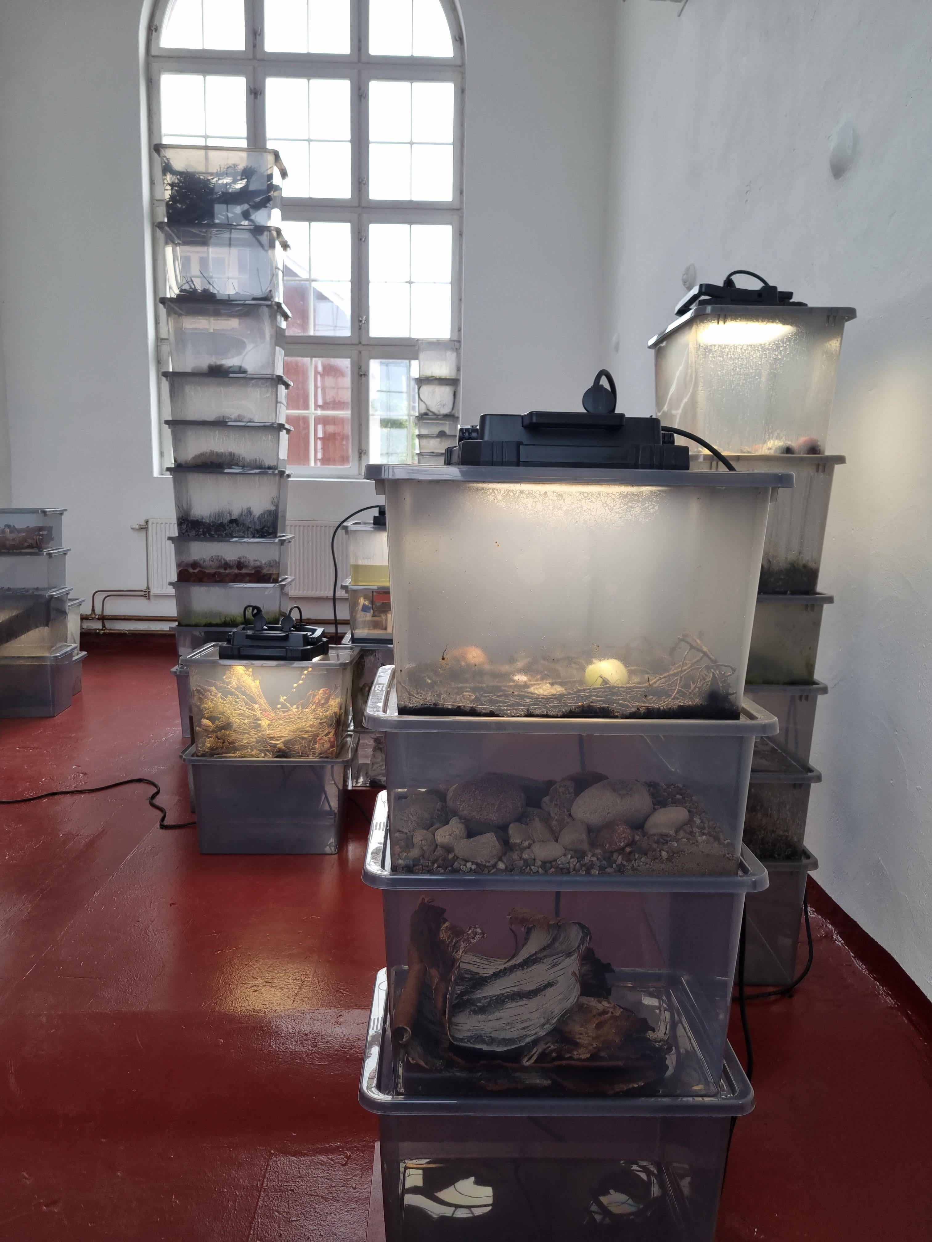 Jag skriver med utsikt över Frösjön och skogen på andra sidan: jag är på ett litet residens på Art Lab Gnesta för att skriva om och utifrån konstnären Evelina Jonssons utställning Sånt som faller. Installationen, som tog sin första form 2021 och sedan dess ställts ut på flera ställen, består av förvaringslådor i plast som konstnären fyllt med olika material. Framför allt organiskt material, som i det slutna rummet börjar brytas ned och ge upphov till nytt liv.